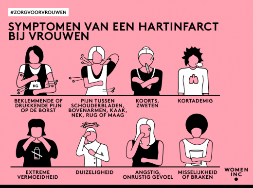 Bij vrouwen wordt een hartinfarct nog wel eens gemist omdat de klachten niet lijken op de klachten bij mannen. Ongeveer 11.000 vrouwen in Nederland krijgen jaarlijks een acuut hartinfarct, waarvan ongeveer 3.000 vrouwen overlijden. Hartaandoeningen zijn na dementie en beroerte de belangrijkste doodsoorzaak bij vrouwen.