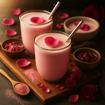 - 1–2 theelepels gedroogde biologische rozenblaadjes of 1 theelepel rozenwater (food grade)